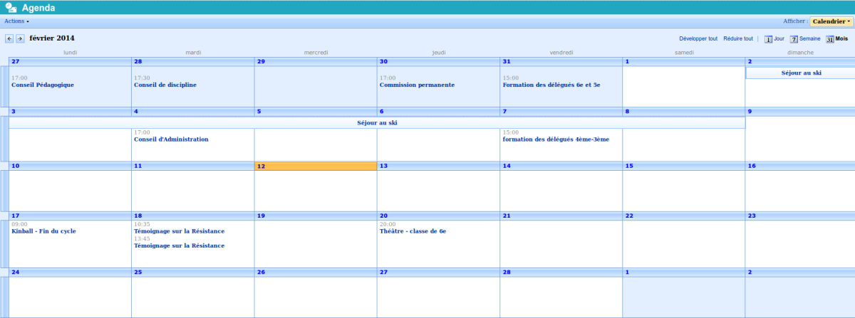 L'agenda de l'établissement est un calendrier, consultable par jour, par semaine ou par mois, et dans lequel les événements sont cliquables pour permettre d'en obtenir un descriptif (et d'accéder à d'éventuels documents joints). Les événements peuvent être réguliers et périodiques.