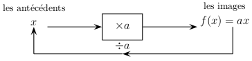 Le procédé \(f : x \longmapsto ax\), qui au nombre \(x\) associe le nombre \(ax\) s'appelle une fonction linéaire.