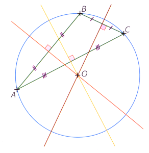 Ainsi \(OA=OB=OC\). Le point \(O\) est aussi sur la médiatrice du segment \([AC]\).