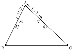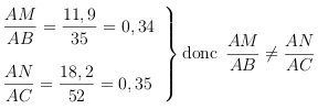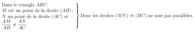 Si deux des rapports \(\dfrac{AM}{AB}\), \(\dfrac{AN}{AC}\), \(\dfrac{MN}{BC}\) sont différents alors les droites \((BC)\) et \((MN)\) ne sont pas parallèles.