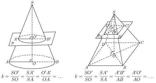 La section d'une pyramide (ou d'un cône de révolution) par un plan parallèle à la base est une réduction de la base de la pyramide (ou du cône) - voir la section "Pyramide" ou "Cône de révolution" -. Le rapport de réduction \(k\) est égal au quotient d'une longueur de la petite pyramide ou du petit cône par la longueur correspondante de la pyramide ou du cône de départ. (Le rapport d'agrandissement est l'inverse de celui de réduction).