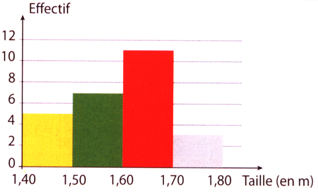 Taille \(t\) (en m) | \(1,40\leqslant t<1,50\) | \(1,50\leqslant t<1,60\) | \(1,60\leqslant t<1,70\) | \(1,70\leqslant t<1,80\) |