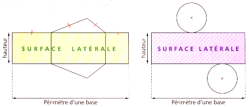 L'aire latérale \(\mathcal{A}\) d'un prisme droit ou d'un cylindre de révolution, c'est à dire l'aire de sa surface latérale, est le produit du périmètre d'une base \(\mathcal{P}_{base}\) par sa hauteur \(h\).