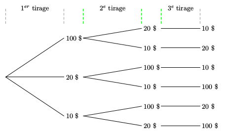 Trois tirages successifs d'un billet dans une urne en contenant trois.