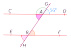 les angles alternes-internes \(\widehat{CAB}\) et \(\widehat{GBF}\) ont la même mesure. Donc \(\widehat{CAB}=56°\).