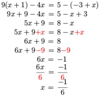 Résoudre l'équation \(9(x+1)-4x=5-(-3+x)\)