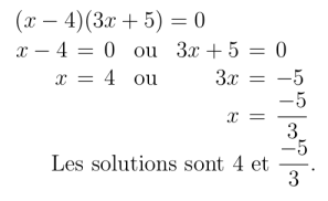 Résoudre l'équation \((x-4)(3x+5)=0\).